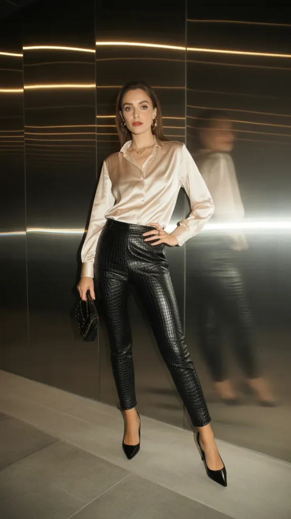 16. Black Croc-Embossed Leather Leggings with a Satin Blouse and Heels