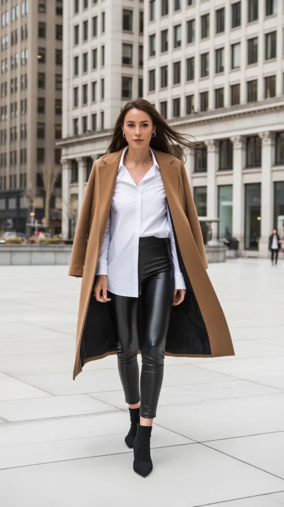 2. Black Leather Leggings with a White Button-Down and Camel Wool Coat