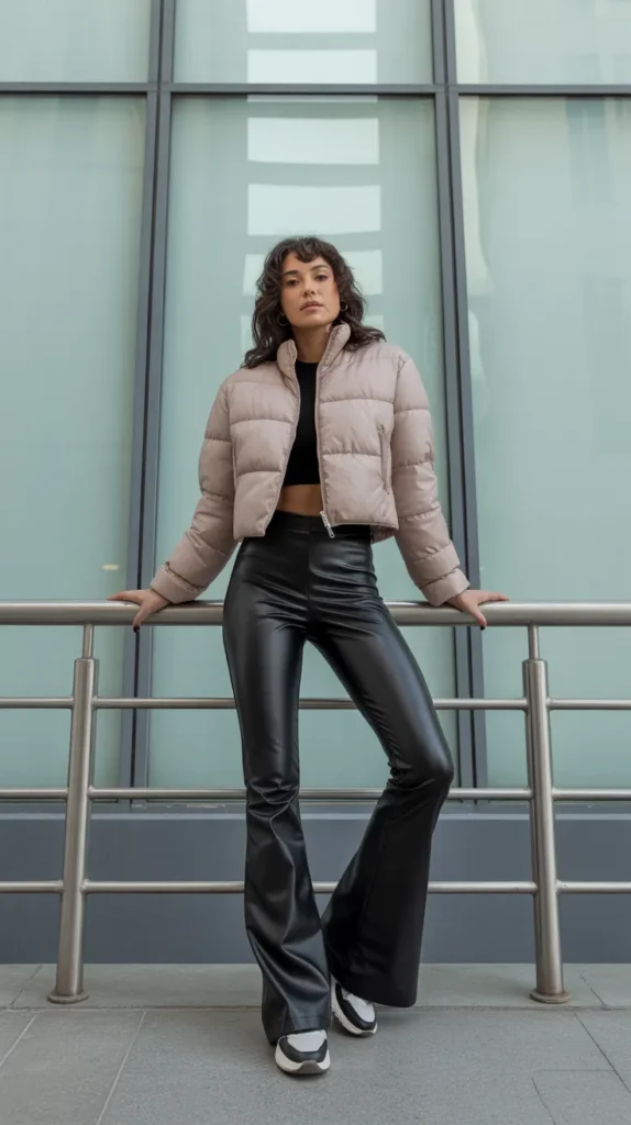 For days when comfort calls but you still want style, this look delivers. Flared leather leggings bring a retro touch, while a cropped neutral puffer keeps things fresh and functional. Add white sneakers and a sleek bun for that “on-the-go but still cute” streetwear energy.