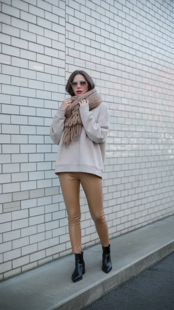 6. Camel Leather Leggings with an Oversized Hoodie and Chunky Scarf