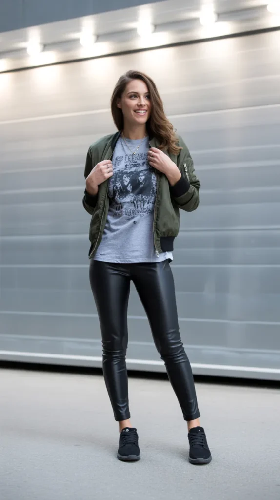 7. Black Leather Leggings with a Grey Graphic Tee and Bomber Jacket
