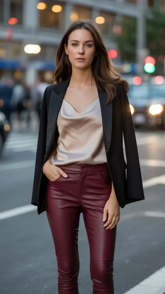 8. Burgundy Leather Leggings with a Black Blazer and Silk Cami