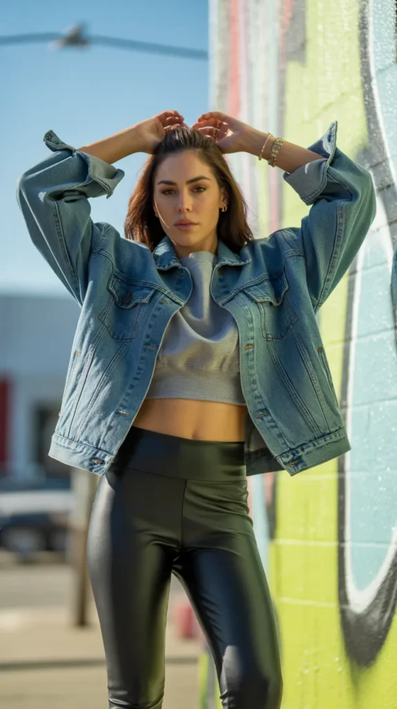 Casual cool done right. A cropped grey sweatshirt layered under a boxy denim jacket keeps things relaxed but flattering. Pair with matte leather leggings for a toned-down shine that works beautifully for daytime errands or travel days. Add sneakers and a messy bun to complete the vibe.