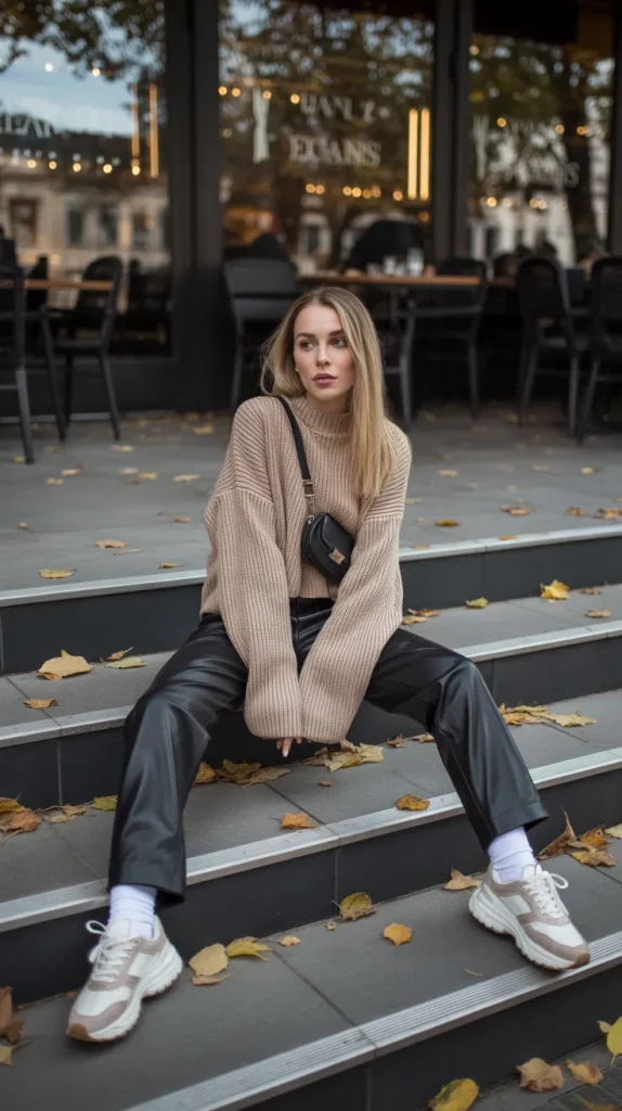 When cozy meets chic, magic happens. Black leather pants styled with a chunky beige sweater give you balance: soft on top, sleek on the bottom. Add chunky sneakers and a crossbody bag, and you’ve nailed outfit chic without even trying. This look is perfect for casual days when you still want to look intentional. Bonus? It’s comfy enough to lounge in but stylish enough to hit the streets.