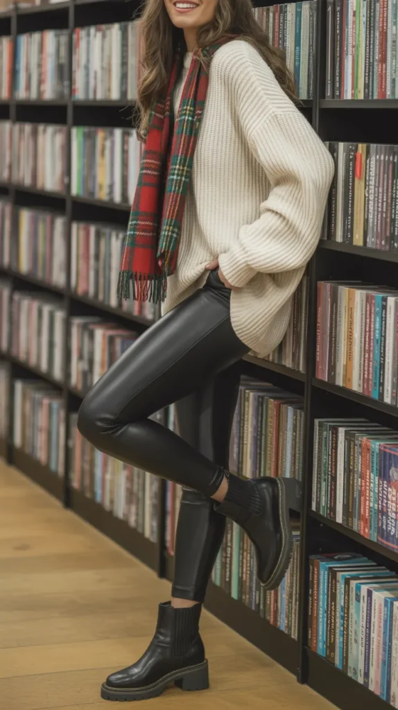 Black leggings with a chunky cream knit sweater is the ultimate leggings outfit winter classic. Add ankle boots and a plaid scarf, and suddenly you’re warm, cozy, and totally chic. This winter outfit works for coffee runs, casual dinners, or just hanging out at home. Cold weather outfits don’t need to be complicated when you have basics like this. It’s the kind of casual outfit that feels effortless but still stylish.