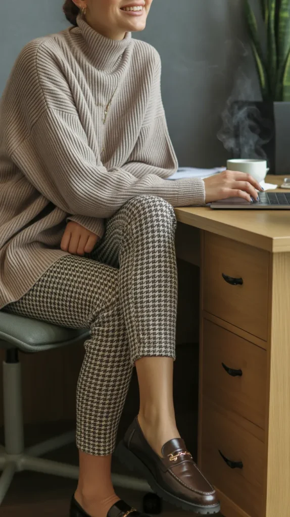 Patterned leggings like houndstooth styled with a tunic sweater are a fun twist for casual outfits. Add loafers and a crossbody bag to keep it chic but easy. This leggings outfit winter option gives personality without trying too hard. Cold weather outfits with prints are a great way to break up basics. It’s casual, cute, and so cozy.
