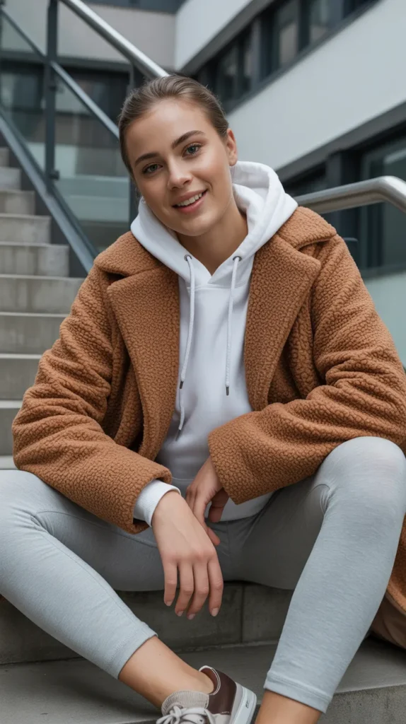 Grey leggings paired with a white hoodie under a caramel teddy coat is pure winter coziness. Sneakers keep the look relaxed and casual. This leggings outfit winter combo works perfectly for casual errands or travel days. Cold weather outfits don’t get more comfortable than this. It’s like wearing a hug, but make it chic.
