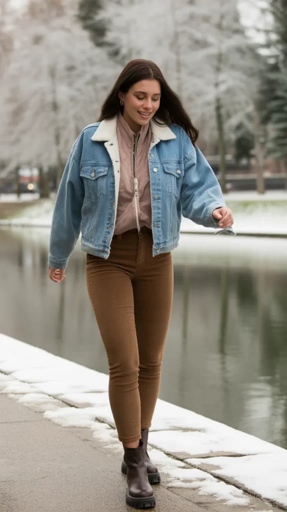 Brown corduroy leggings with a sherpa-lined denim jacket make casual winter outfits extra playful. Add chunky boots and a beanie for a rustic seasonal vibe. This leggings outfit winter look works for weekends or outdoor strolls. Cold weather outfits with corduroy always feel warm and nostalgic. It’s casual but still full of personality.