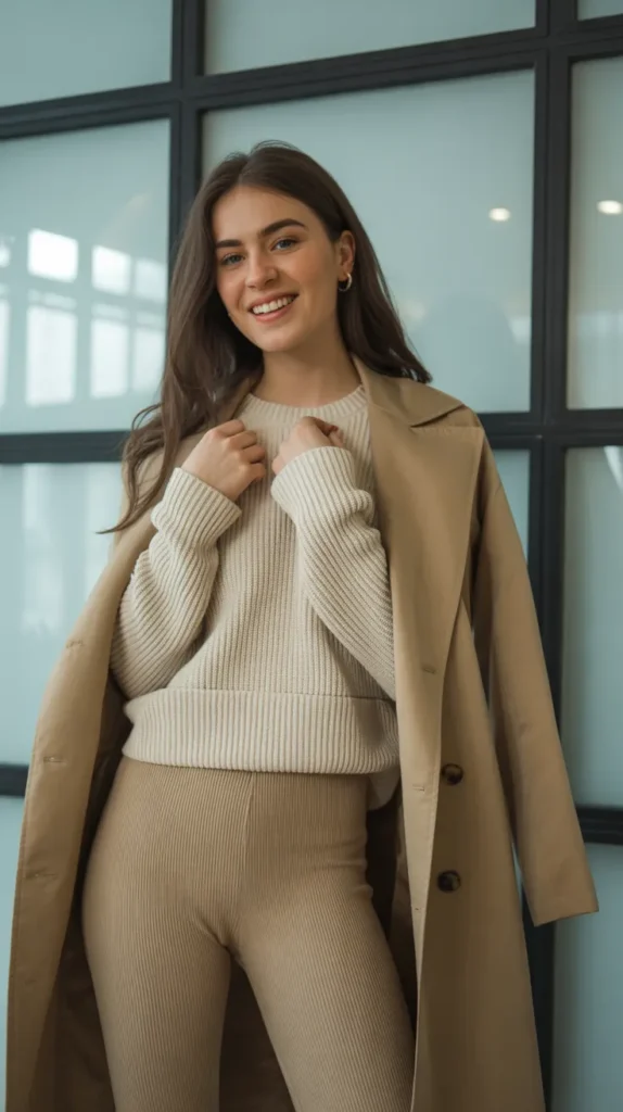 Beige ribbed leggings with a cream sweater and a trench coat is how to dress in winter with polish. Add sneakers or ankle boots to keep it casual but chic. This leggings outfit winter combo feels modern and versatile. Cold weather outfits with neutral layering pieces always look intentional. It’s casual outfits elevated just the right amount.