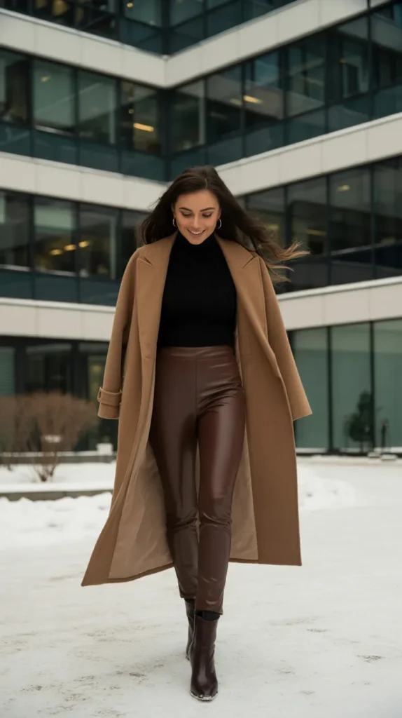 Brown faux leather leggings paired with a camel wool coat is the definition of polished winter outfit energy. Add heeled boots and a structured bag for instant chic. This leggings outfit winter combo works perfectly for casual workdays or dinners out. Cold weather outfits feel elevated with faux leather because they add a little texture and shine. It’s a casual outfit that proves leggings can be classy too.