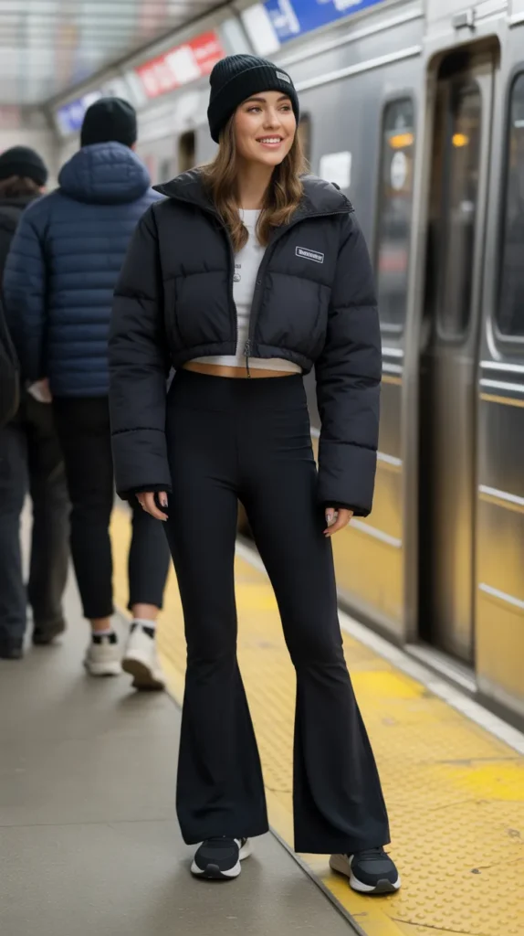 Flared leggings styled with a cropped puffer jacket, sneakers, and a beanie bring sporty casual vibes to winter. It’s comfortable enough for errands but still looks put together. This leggings outfit winter option balances cozy with cool thanks to the cropped jacket. Cold weather outfits don’t have to be boring when you mix shapes like flares and puffers. It’s casual outfits at their comfiest, no doubt.