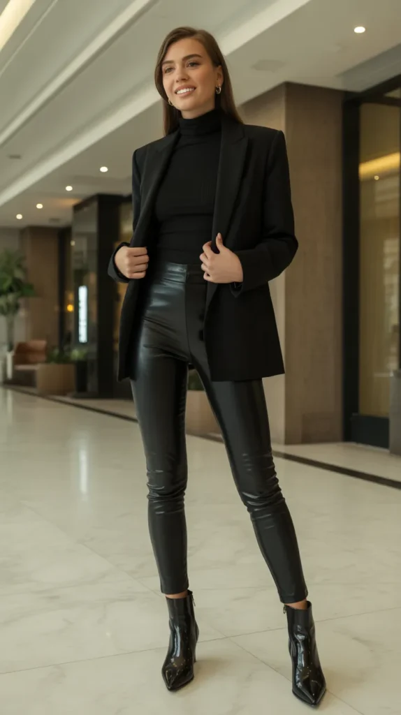 8. Black Faux Leather Leggings with Blazer