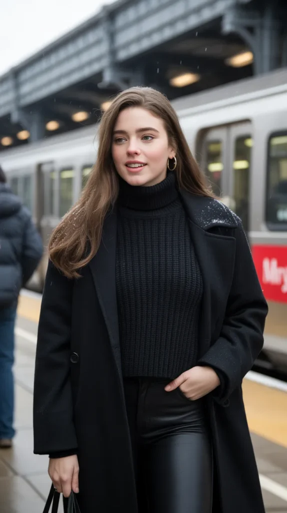 Black leggings styled with a turtleneck under a chunky knit sweater and a wool coat is the ultimate timeless winter outfit. Add boots and a scarf for a chic cold weather outfit you’ll wear on repeat. This leggings outfit winter idea feels effortless but polished. Casual outfits built with classics like these never go out of style. It’s exactly how to dress in winter without losing comfort.