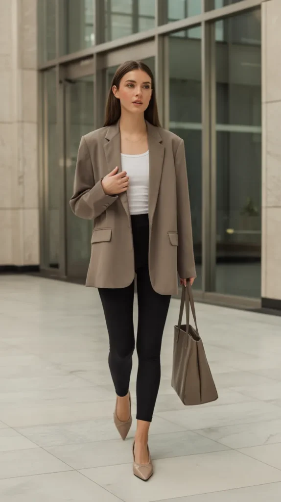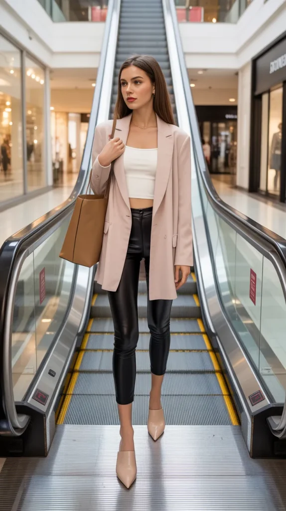 Cropped leggings can look incredibly polished when styled right. Pair them with a pastel longline blazer, pointed mules, and a sleek tote for a casual chic outfit that leans professional. This is perfect for those in-between occasions when you want style but don’t want to overdress. The cropped cut keeps it playful, while the blazer brings the sophistication. Honestly, it’s the perfect mix of smart and casual.