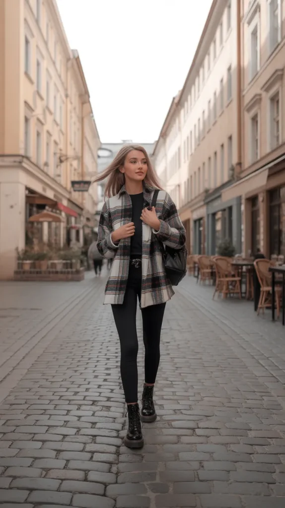 Shackets (shirt-jacket hybrids) are still trending, and they look amazing with leggings. Black leggings, a neutral plaid shacket, combat boots, and a structured mini backpack create an outfit that feels stylish and modern. It’s giving casual chic outfit vibes with a side of streetwear. Perfect for transitional weather when you don’t want a heavy coat but still need layers. Leggings and shackets were basically made for each other comfortable and effortlessly cool.