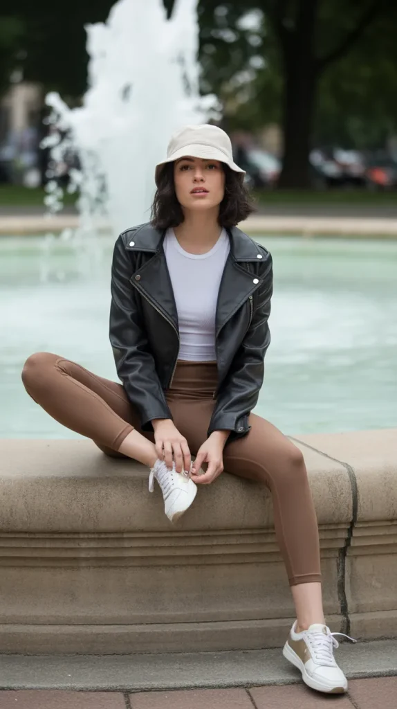 Brown leggings add warmth, and when paired with a fitted white tank and a cropped leather jacket, the result is street style magic. Add sneakers and a bucket hat, and suddenly you’re the effortlessly cool friend everyone wants style tips from. This chill outfit works for weekends, casual dinners, or even concerts. It’s fun, modern, and just edgy enough.