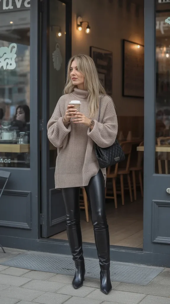 This outfit is cozy chic perfection. Leather leggings, a slouchy oversized knit sweater, knee-high boots, and a quilted crossbody create balance between soft and edgy. It’s the ultimate cold-weather casual chic outfit. Ever notice how leather leggings instantly take things from “basic” to “bold”? Yeah, this look proves it. Perfect for holiday parties, winter brunch, or any occasion you want comfy glam.