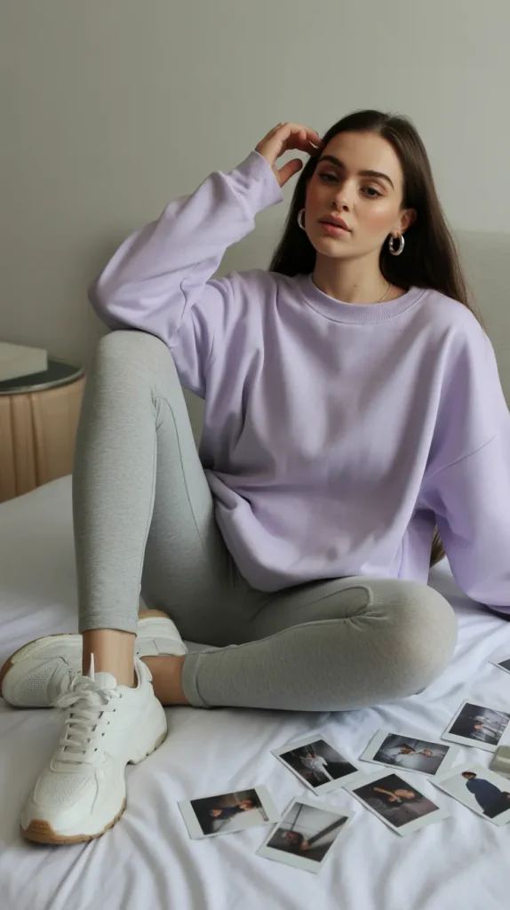 Comfort queens, this one’s for you. Grey leggings with an oversized pastel sweatshirt, chunky sneakers, and hoop earrings = instant chill outfit energy. It’s simple, easy, and one of those fits you’ll wear over and over. Whether you’re working from home, running errands, or meeting a friend, it hits the sweet spot of comfy and cute.
