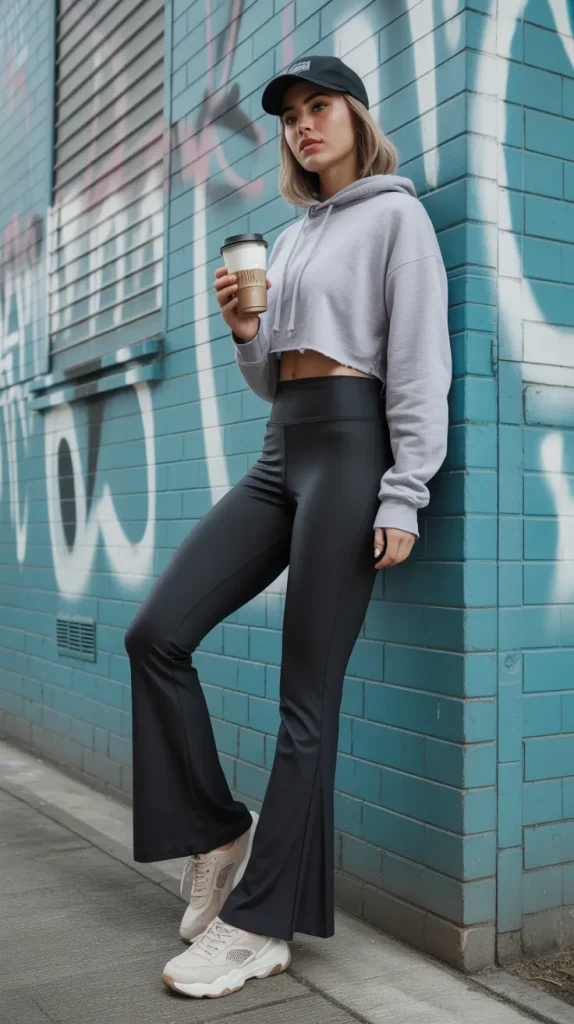 If you’re leaning sporty but still want to look stylish, flare leggings are your best friend. Pair them with a cropped grey hoodie and chunky sneakers for a laid-back casual sporty outfit. Toss on a baseball cap, and you’re instantly channeling athleisure vibes that feel modern and cool. The flared shape adds drama (and a little sass), while the hoodie keeps it comfy. Perfect for running errands, brunching with friends, or just pretending you’re on your way to Pilates. Ever have one of those days where you want to look good but secretly feel like wearing sweatpants? This outfit is the solution.