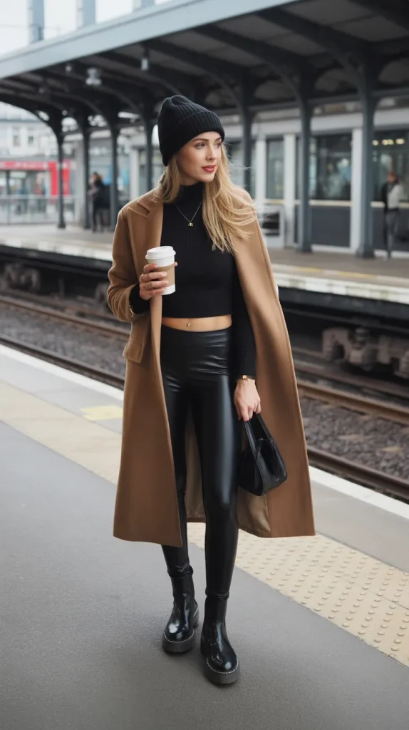 When the cold hits, leggings don’t retire they level up. Black leggings with a turtleneck, a long camel wool coat, Chelsea boots, and a beanie create a winter-ready chic look. This is the definition of outfits with leggings that prove comfort and fashion can coexist. You’ll be warm, stylish, and absolutely Instagram-worthy.