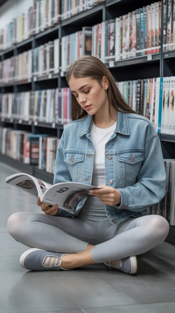 Grey leggings don’t get enough love, but they’re just as versatile as black. Pair them with a simple white tee, a light-wash denim jacket, and slip-on sneakers for a relaxed casual outfit. Add aviator sunglasses, and suddenly you’ve got looks street style vibes without even trying. It’s the ultimate chill formula for weekends, and you’ll look stylish even if your plans are just hitting the grocery store. Ever notice how denim has that magical ability to make basics look elevated? Yep, this outfit is proof.