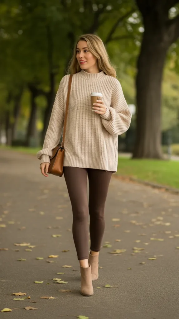 Brown leggings are an underrated fall staple. Style them with an oversized cream knit sweater, ankle boots, and a crossbody saddle bag, and you’re golden. This is one of those casual chic outfits that feels cozy but still Instagram-worthy. The earthy tones scream autumn vibes, and the chunky sweater balances out the fitted leggings perfectly. Whether you’re heading to a coffee shop or just taking a chilly stroll, this outfit is a hug in clothing form. Ever wanted to look like “fall personified”? Brown leggings will get you there.