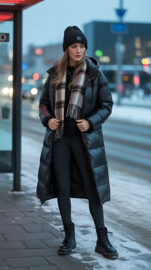 Let’s be honest: winter is leggings’ time to shine. Thermal black leggings, a long puffer coat, lace-up boots, a beanie, and a chunky scarf create the ultimate chill outfit. You’re warm, comfortable, and still stylish enough to be spotted in public. Ever tried squeezing into jeans when it’s below freezing? Not fun. Leggings give you stretch and insulation, and when paired with a big puffer, they look purposeful instead of lazy. Basically, this outfit says, “Yes, I value warmth, but no, I will not sacrifice style.”