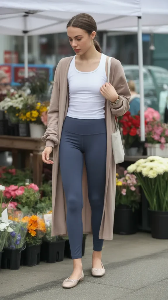 If you’re tired of the black-and-grey rotation, navy blue leggings bring a fresh twist. Style them with a fitted white tank, a beige longline cardigan, and ballet flats for an everyday chic look. A mini shoulder bag keeps it polished. This is one of those outfits with leggings that feels grown-up but not boring. It’s soft, flattering, and gives off those “just stepped out of a Pinterest board” vibes. Honestly, blue leggings deserve way more hype.