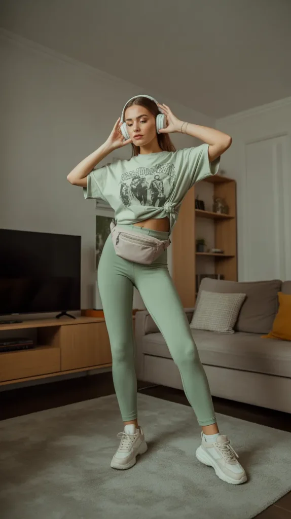 For days when comfort rules, go for sage green leggings and an oversized band tee. Chunky white sneakers and a crossbody fanny pack finish the look. It’s the perfect casual sporty outfit with a trendy twist. The oversized tee balances the slim leggings, and the sneakers keep it playful. Whether you’re heading to a casual hangout or a quick Target run, this outfit screams effortless. Ever wanted to look cool but still feel like you’re in pajamas? Say hello to this combo.