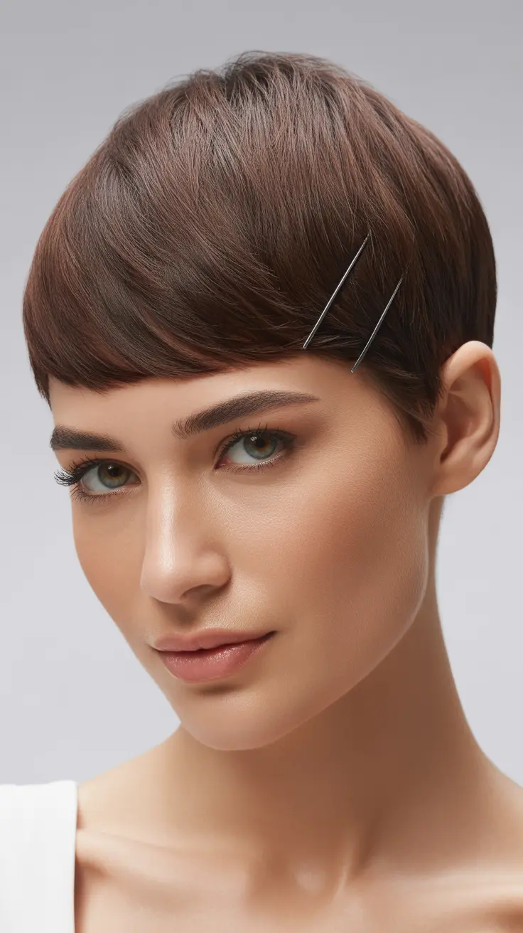 The chic pixie cut is a timeless style that never fails to impress. This look combines a playful vibe with a touch of sophistication, making it perfect for any occasion. The light chocolate brown hair color adds warmth and depth, enhancing the overall appearance.
