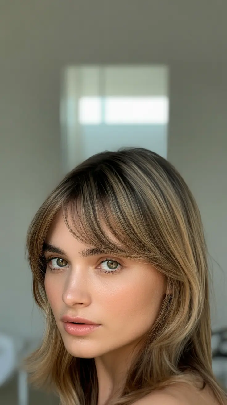 The soft layers blend seamlessly with the light brown hair color, giving it depth and movement. The side-swept bangs draw attention to the eyes, adding a playful yet sophisticated element. This style is perfect for those who want a fresh, modern look without too much fuss.