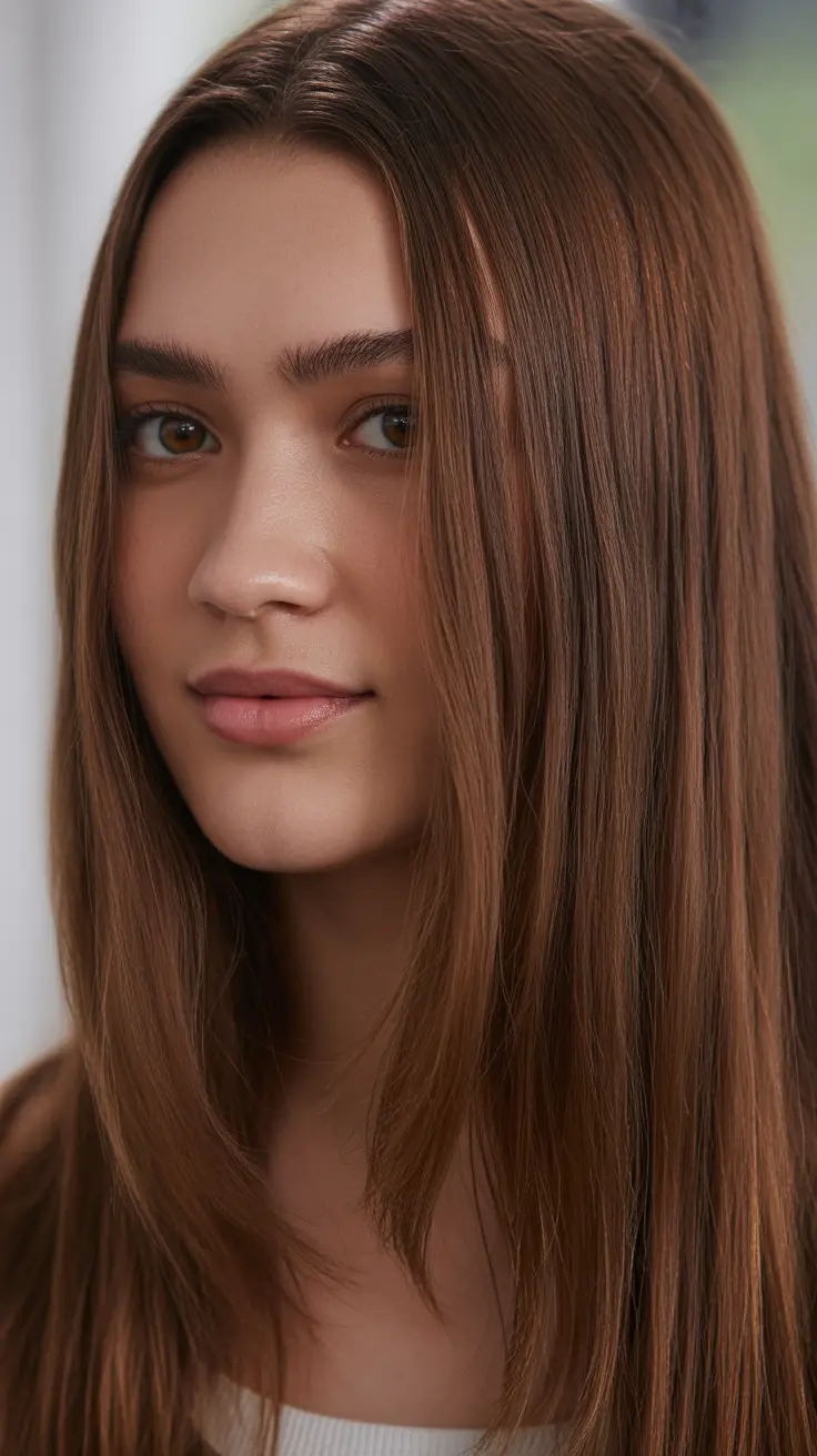The image showcases long, straight hair with a shiny, polished look. The light brown hair color shines under the light, highlighting the smooth texture. This style is not only chic but also easy to maintain, making it a favorite among many.