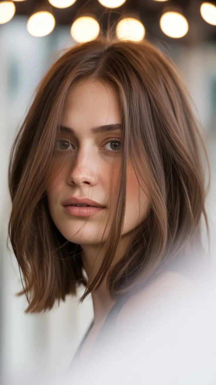 The textured lob is a stylish choice that combines elegance with a relaxed vibe. This hairstyle features light chocolate brown hair, which adds a soft, natural glow to your look. The warm undertones in the hair color enhance the overall effect, making it perfect for any season.