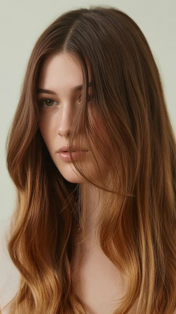 Soft waves paired with caramel highlights create a stunning look that enhances light chocolate brown hair. This style is perfect for anyone wanting to add a touch of warmth and dimension to their hair. The gentle waves add movement, making the hair look lively and full.