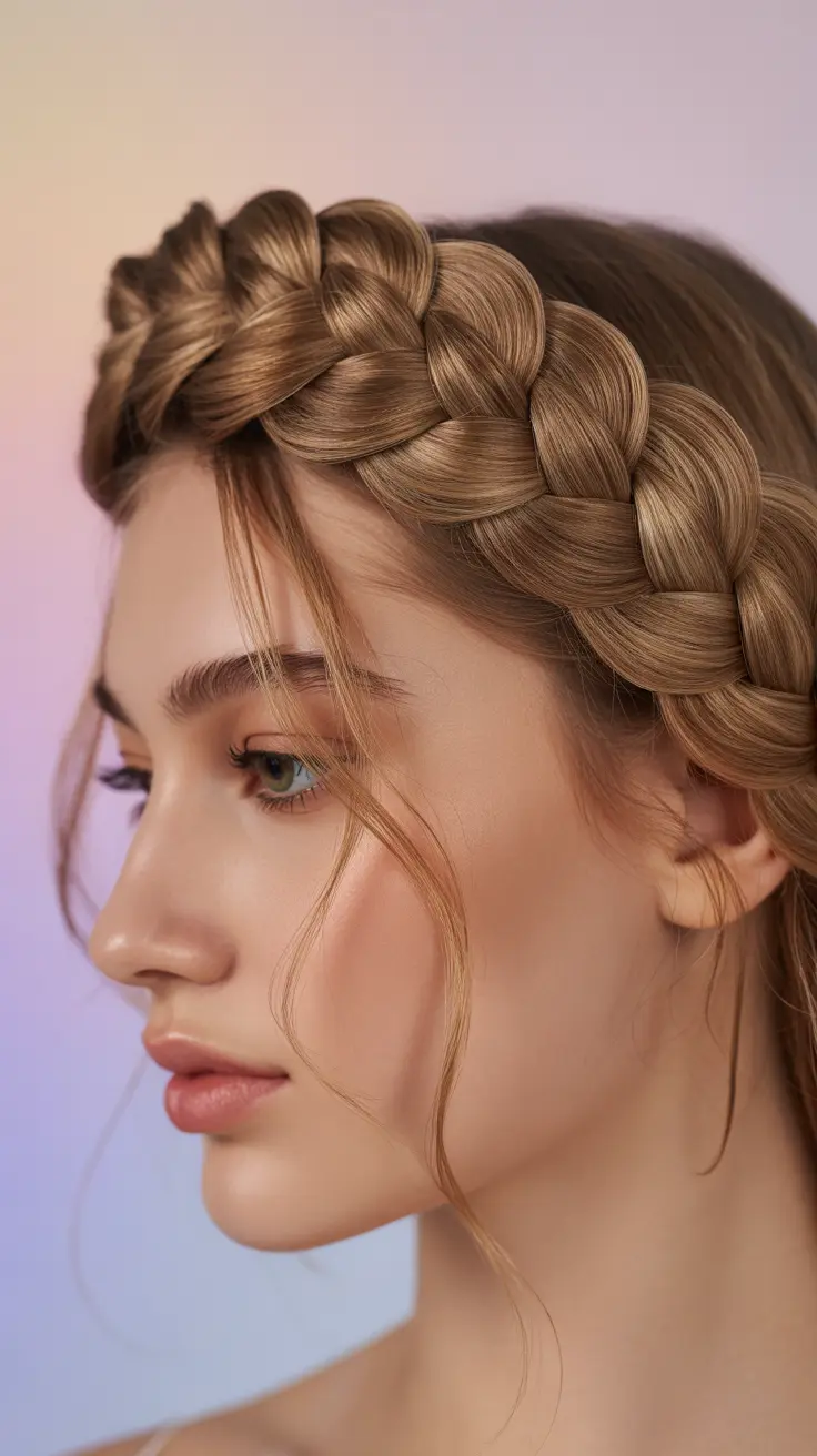 The intricate braiding wraps around the head, giving a regal feel while still being casual enough for everyday wear. The blend of light brown tones adds depth and dimension, making the hair appear fuller and more vibrant.