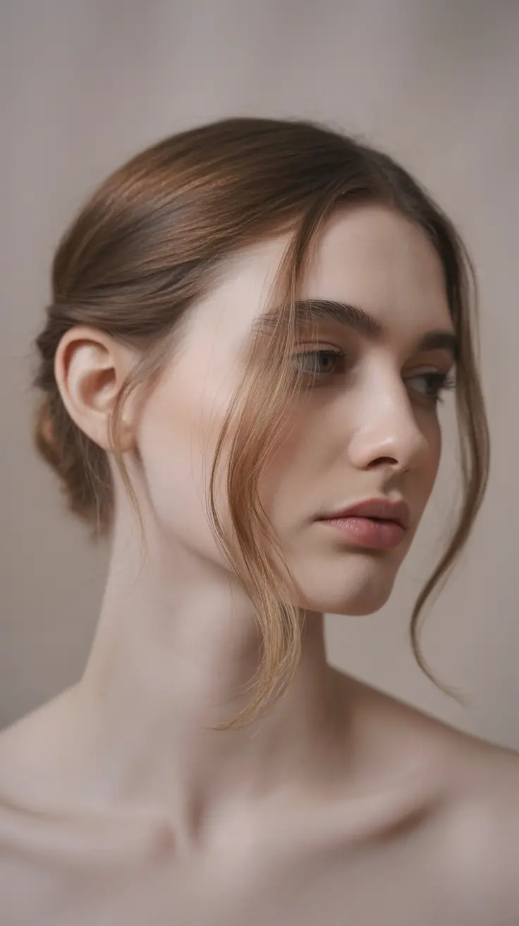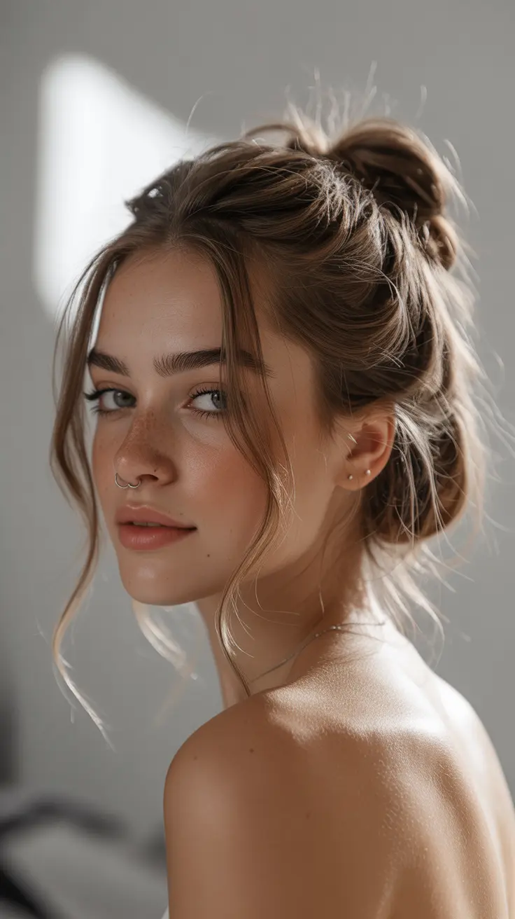 To achieve this look, start by gathering your light brown hair into a loose bun at the crown of your head. Allow a few strands to fall naturally around your face for that effortless touch. The sun-kissed ends add a warm glow, enhancing the overall softness of the style.