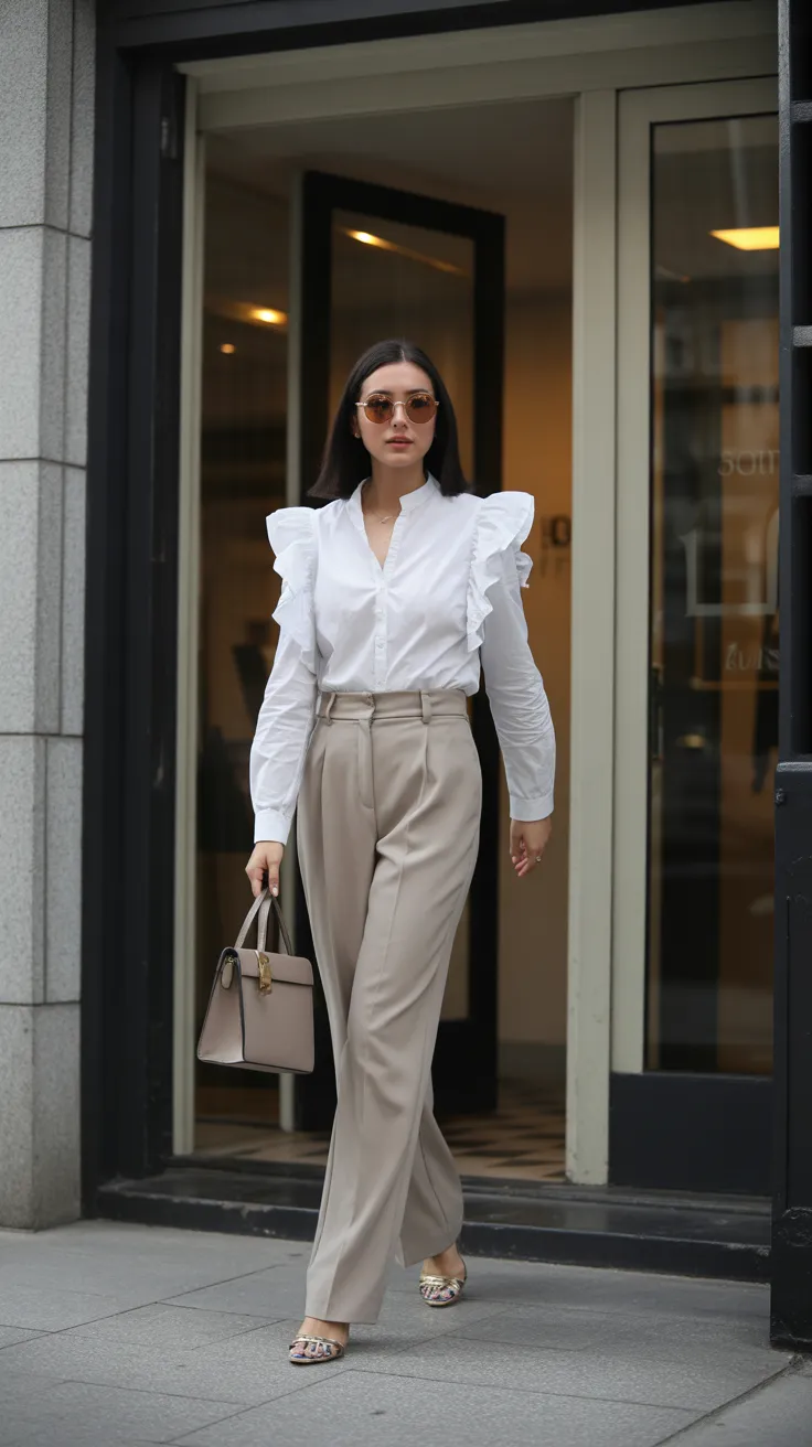 The neutral tones of the trousers complement the crisp white of the blouse, creating a timeless outfit that’s easy to style. This look is versatile enough for the office or a casual outing. You can easily switch up the accessories to match the occasion, whether it’s a statement necklace or simple stud earrings.