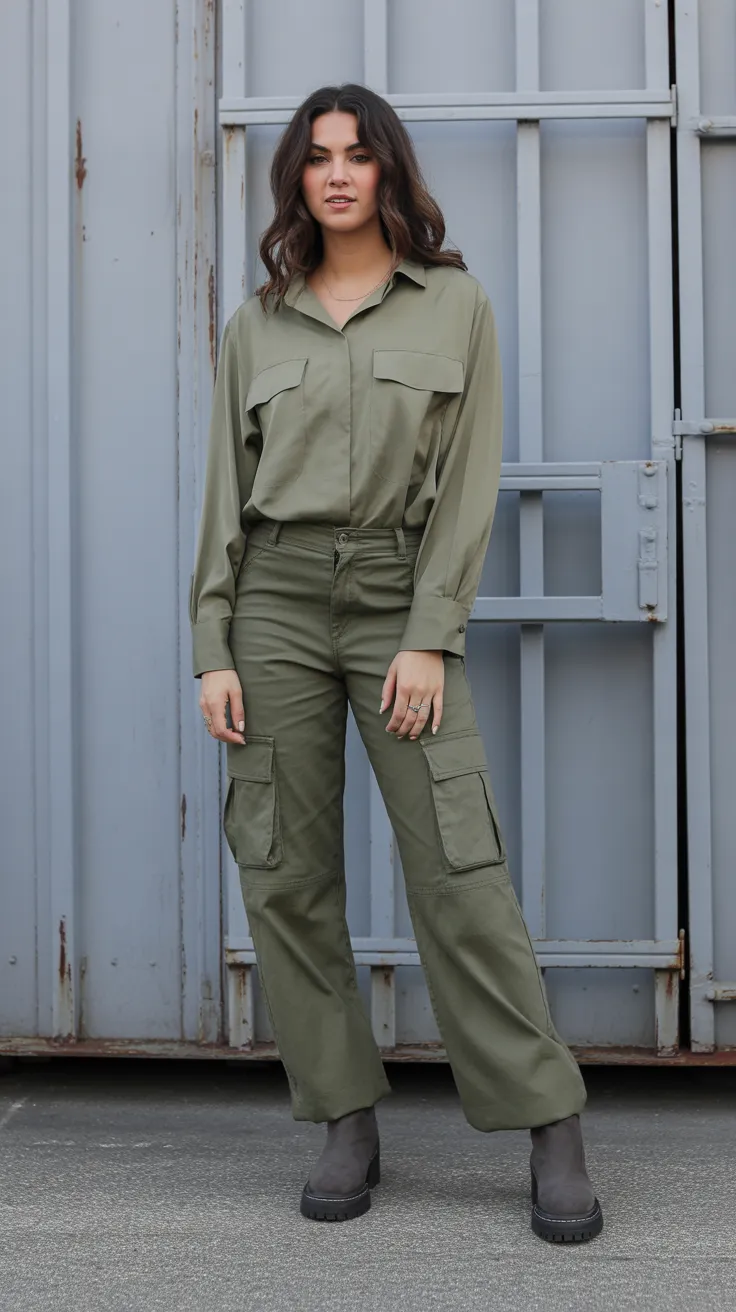10. Olive Green Utility Long Sleeve Blouse Outfit With Cargo Pants