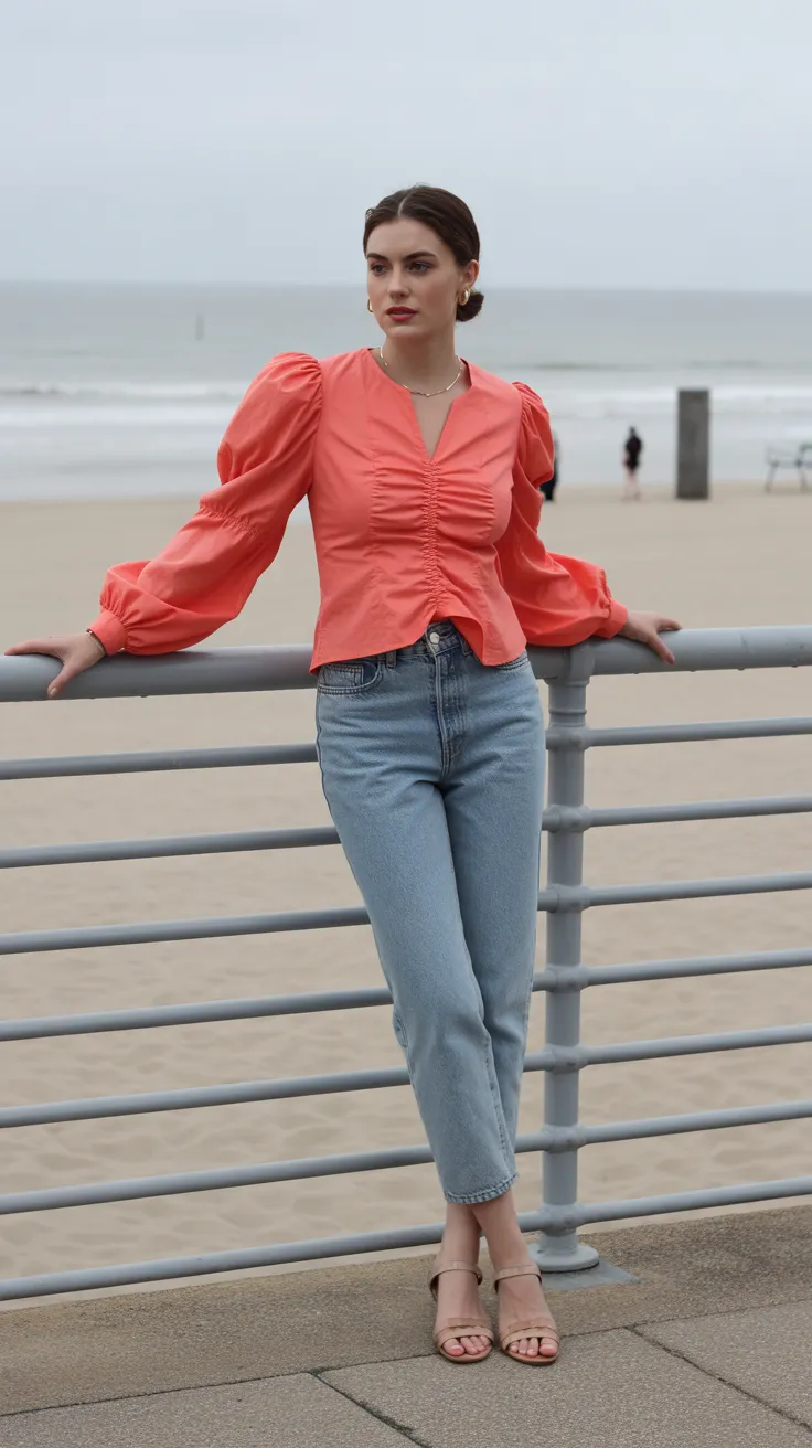 Pairing this blouse with cropped jeans strikes a balance between polished and relaxed. The light wash of the jeans complements the vibrant coral, creating a harmonious look. This outfit is not only stylish but also comfortable, making it a great choice for a day out or a casual gathering.