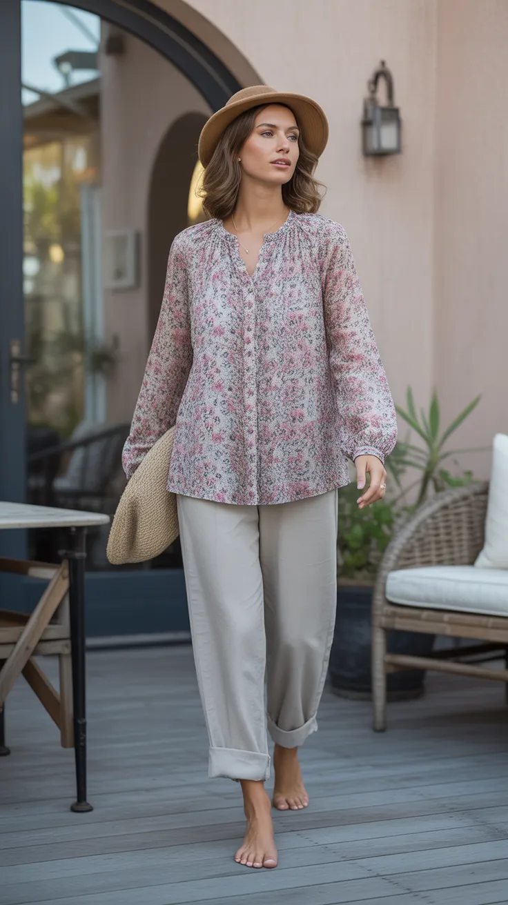 This outfit combines a floral print long sleeve blouse with chic linen pants, creating a polished look that’s perfect for various occasions. The blouse features a soft, pastel color palette adorned with delicate floral patterns, adding a feminine touch to the ensemble. The lightweight fabric of the blouse makes it comfortable for both warm and cool weather.