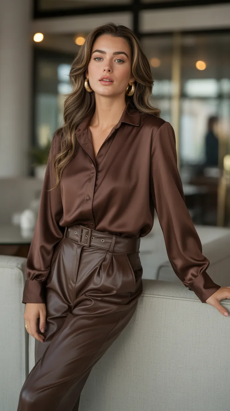 This chocolate brown long sleeve blouse paired with matching belted pants creates a polished look that’s perfect for various occasions. The rich hue of the blouse adds warmth and sophistication, making it a great choice for both work and casual outings.