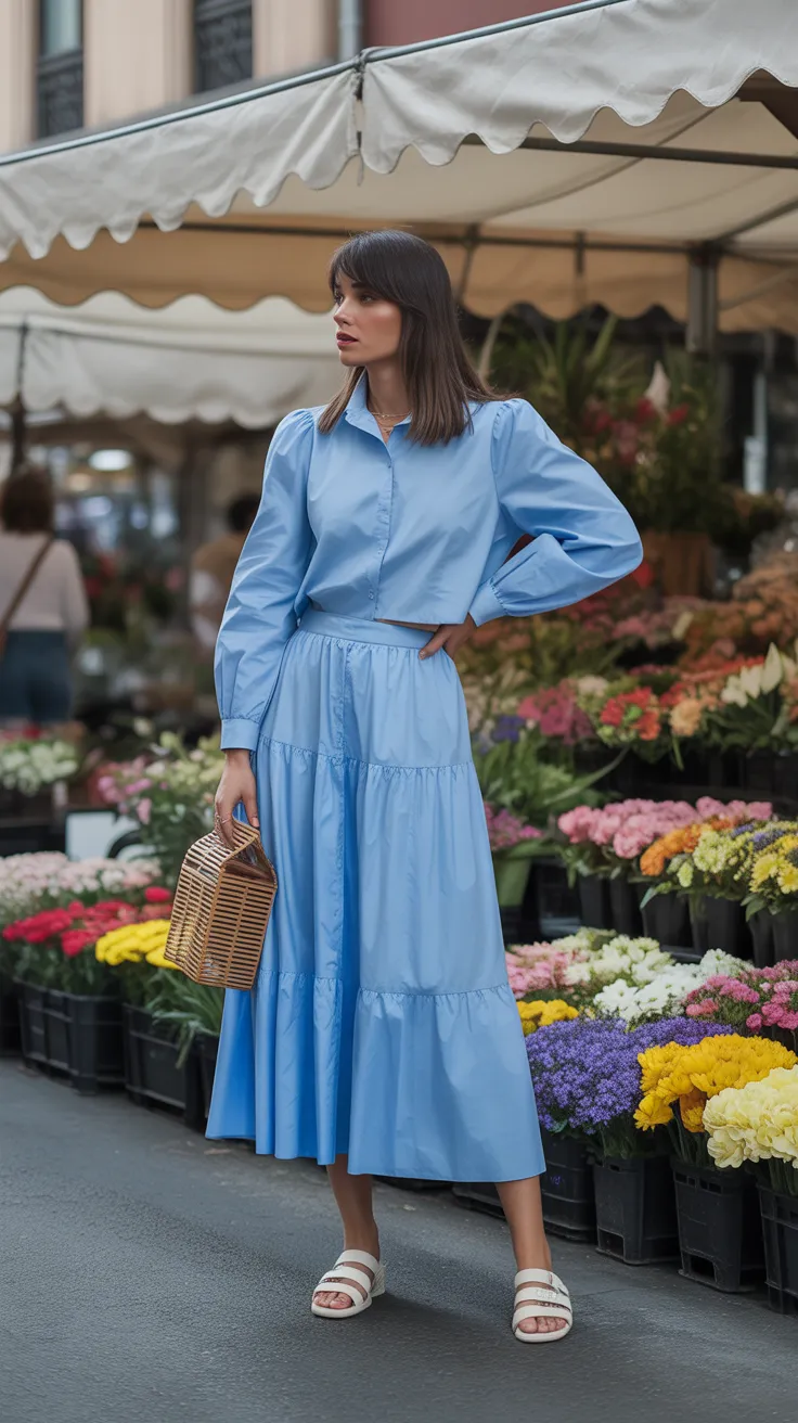 The tiered midi skirt complements the blouse beautifully. Its flowing layers create a feminine silhouette that is both chic and playful. The neutral tone of the skirt balances the vibrant blue, making it a timeless outfit inspo.