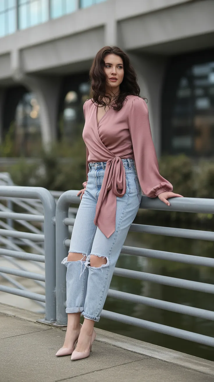 The wrap style of the blouse flatters the figure, creating a lovely silhouette. Pairing it with ripped jeans adds an edgy twist, making this look versatile for various occasions. Whether you’re heading to a coffee shop or meeting friends, this outfit is sure to impress.