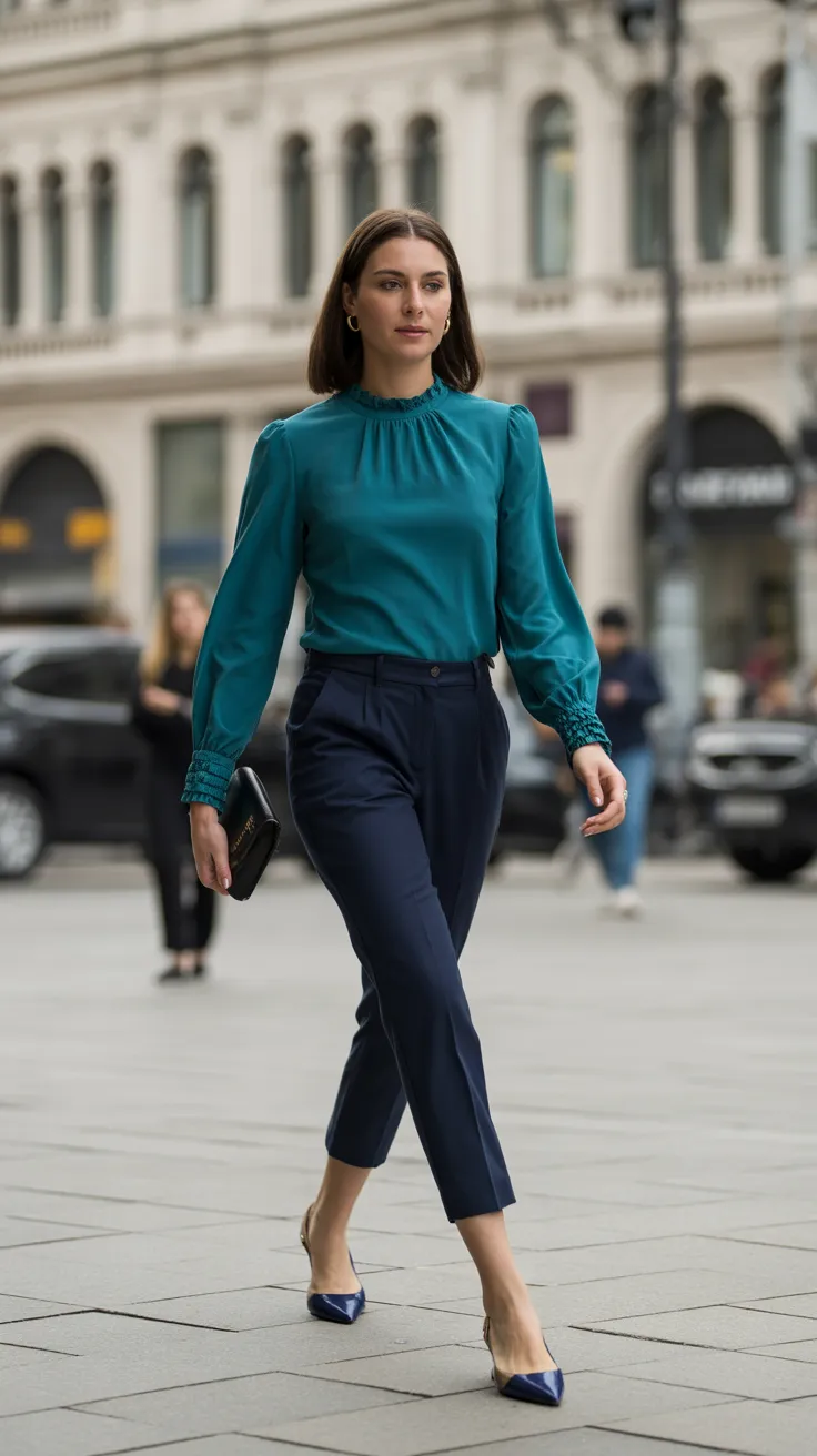 20. Teal Ruffle Neck Long Sleeve Blouse Outfit With Cropped Trousers