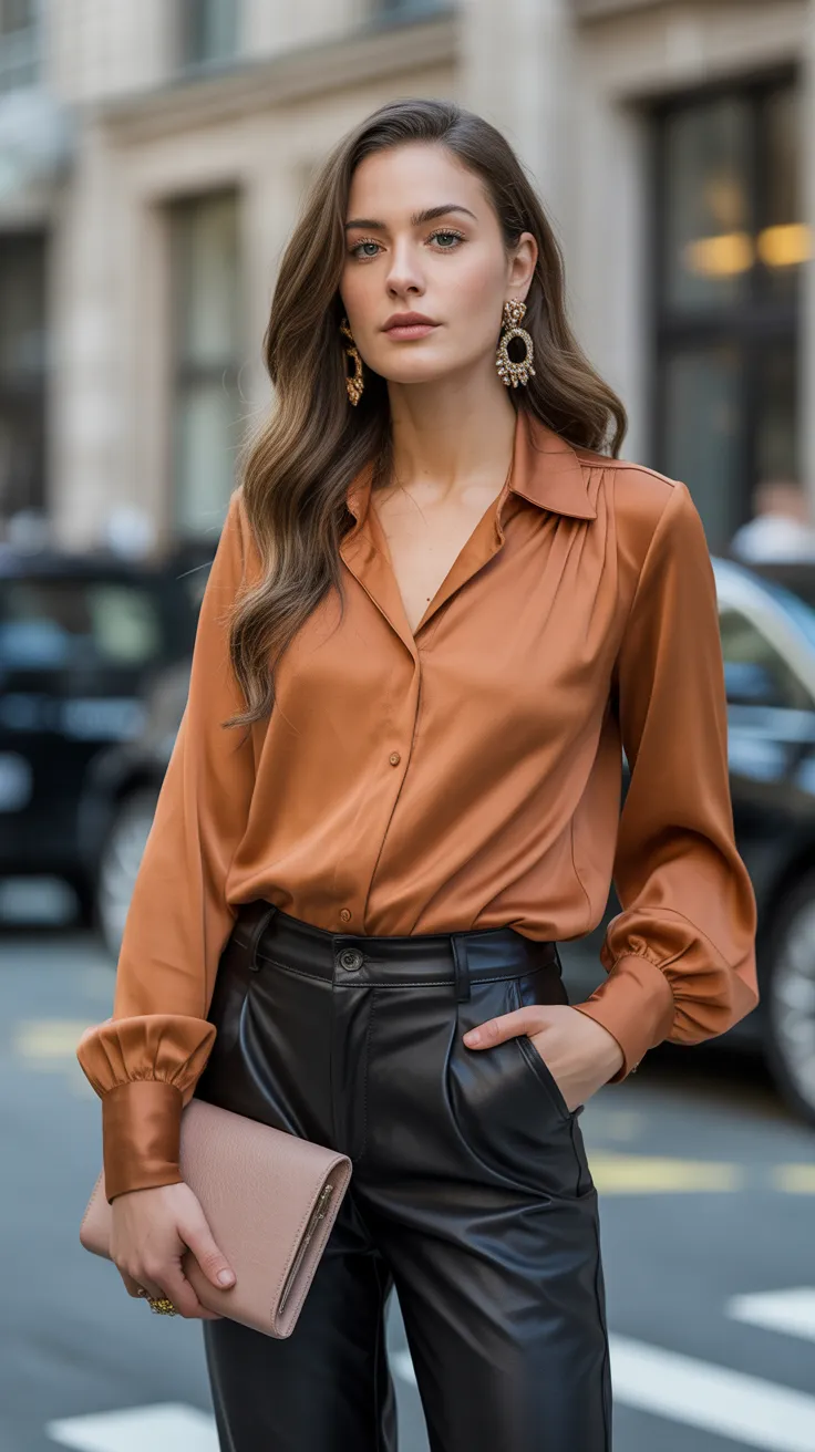 21. Burnt Orange Long Sleeve Blouse Outfit With Leather Pants
