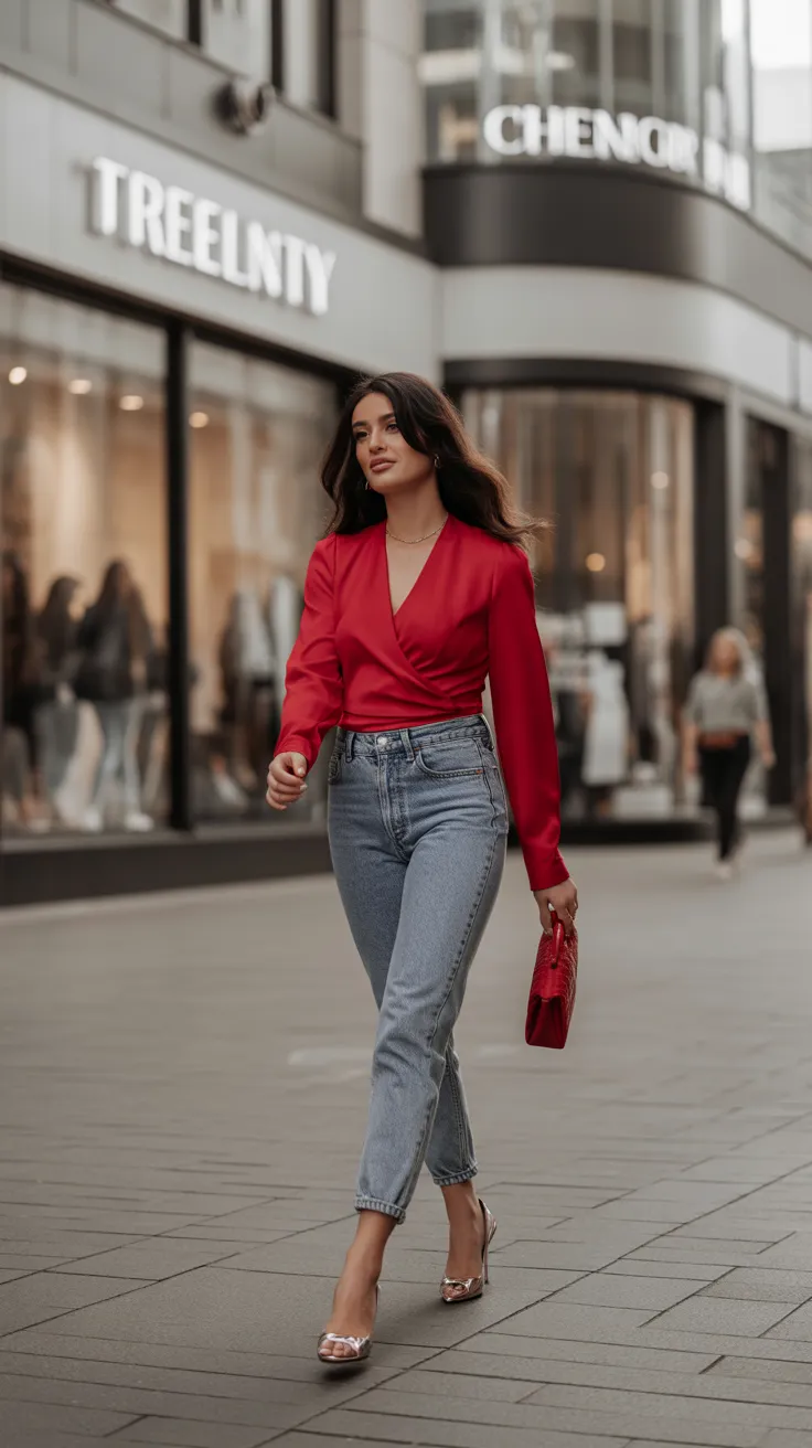 7. Red Long Sleeve Wrap Blouse Outfit With Slim Jeans