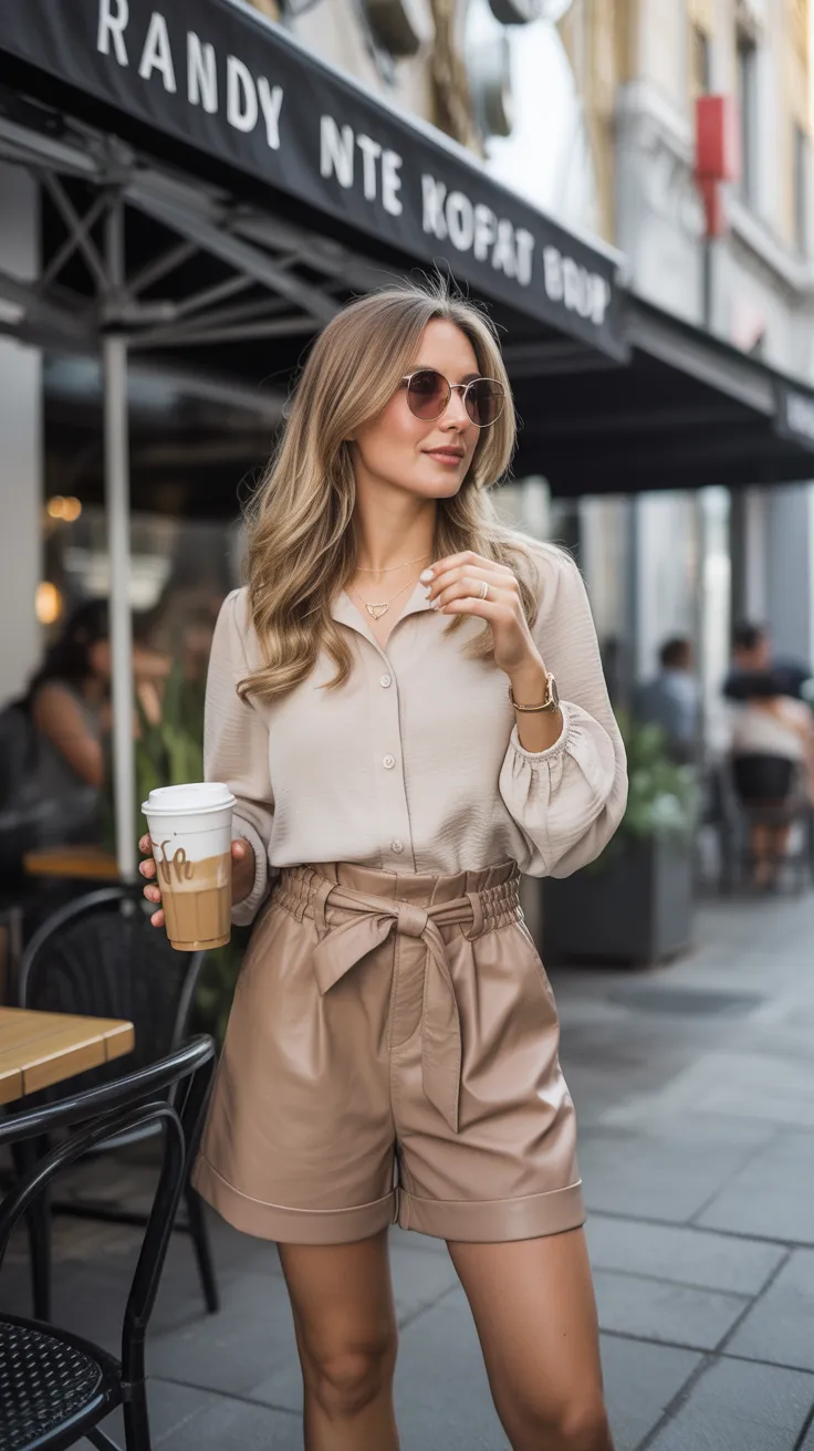 This outfit is a perfect blend of comfort and style. The beige long sleeve blouse offers a soft, neutral tone that pairs beautifully with the crisp white paperbag shorts. This combination creates a fresh and polished look that works for various occasions.