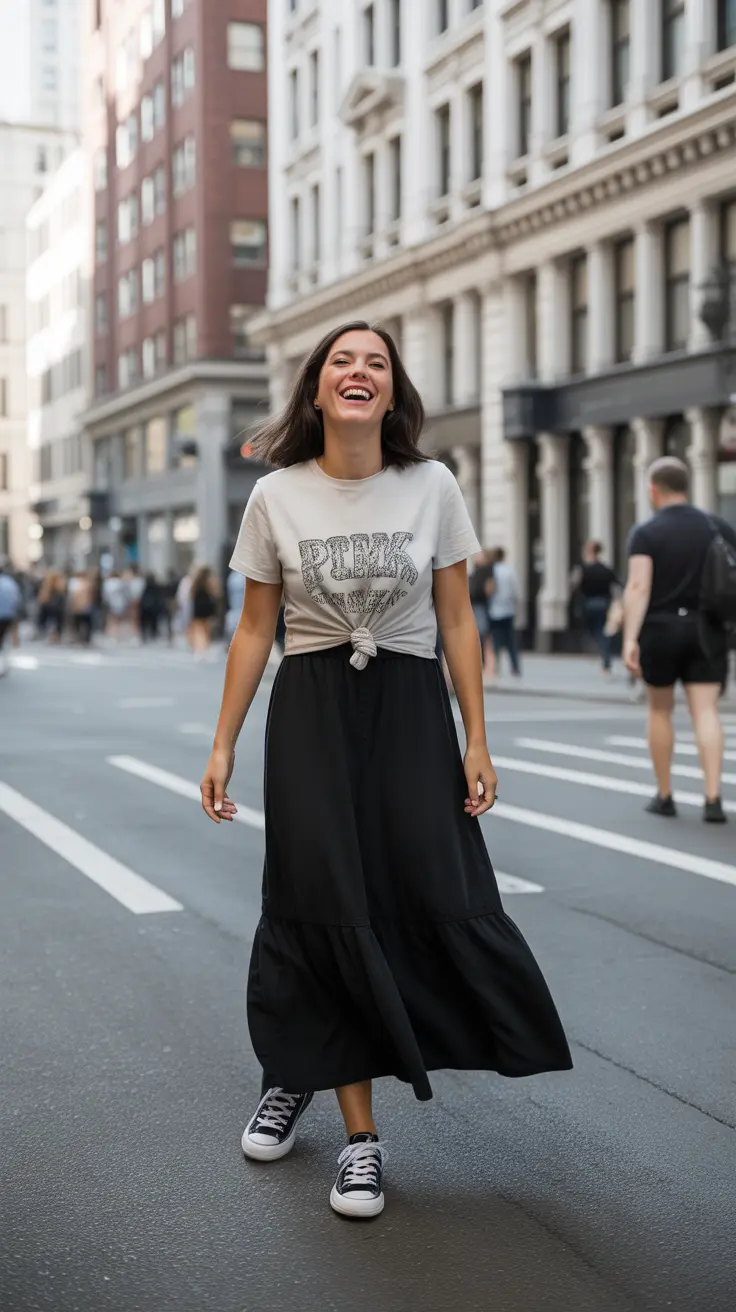 Opting for sneakers keeps the vibe casual while ensuring comfort throughout the day. The maxi black skirt’s flowing silhouette contrasts nicely with the fitted tee, creating a balanced silhouette. This look is ideal for running errands or meeting friends for coffee.