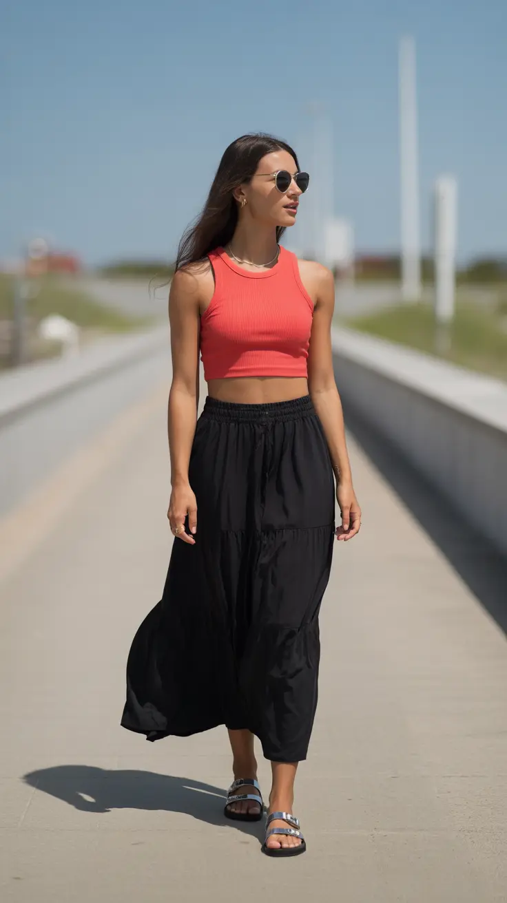 When the sun is shining, a black maxi skirt paired with a crop top is a go-to choice for effortless style. This outfit is not just chic; it’s also super comfortable for those warm summer days. The flowy fabric of the maxi skirt allows for easy movement, making it perfect for a stroll along the beach or a casual outing with friends.