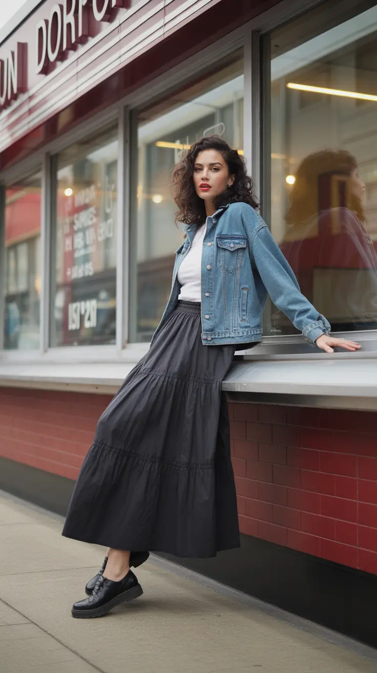 Pairing a black maxi skirt with a denim jacket creates a stylish vintage vibe that’s perfect for any casual outing. The black maxi skirt is a wardrobe essential, offering effortless style and versatility. It flows beautifully, making it easy to dress up or down.